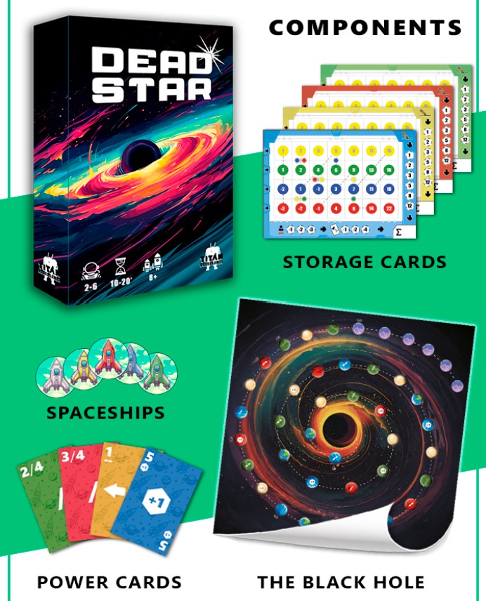 Become a space miner, collecting resources around a star and storing them in your ship. Depending on how you store the resources in your ship’s cargo hold—by grouping similar resources or connecting them to resources in neighboring containers—you’ll achieve a more or less optimized score. Additionally, your cargo hold allows you to use actions to move your opponents or modify the value of your cards.