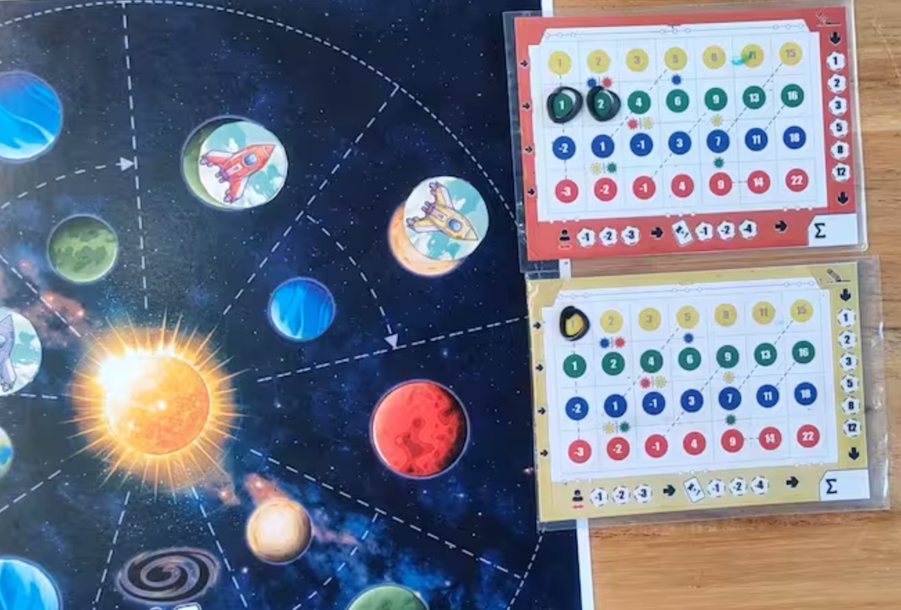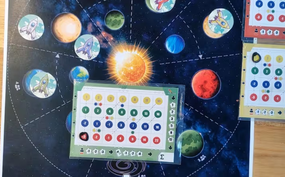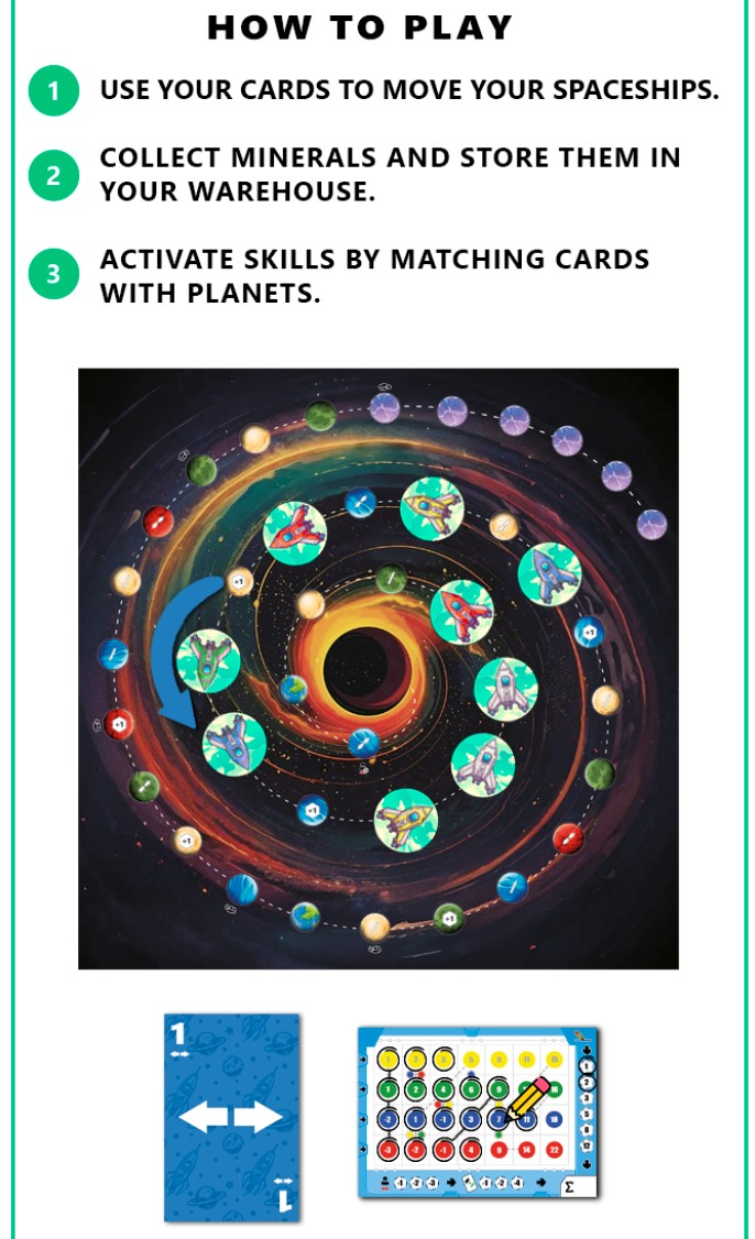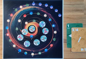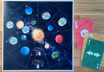 Players will move their ships around the corresponding sun, unable to occupy the same planet and using their cards with different movements and powers.